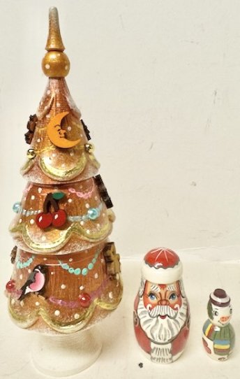 This wooden nesting doll is handcrafted in Moscow, Russia: made out of linden wood and painted with acrylic. Every single Christmas ornament is individually carved and painted and glued to the tree.