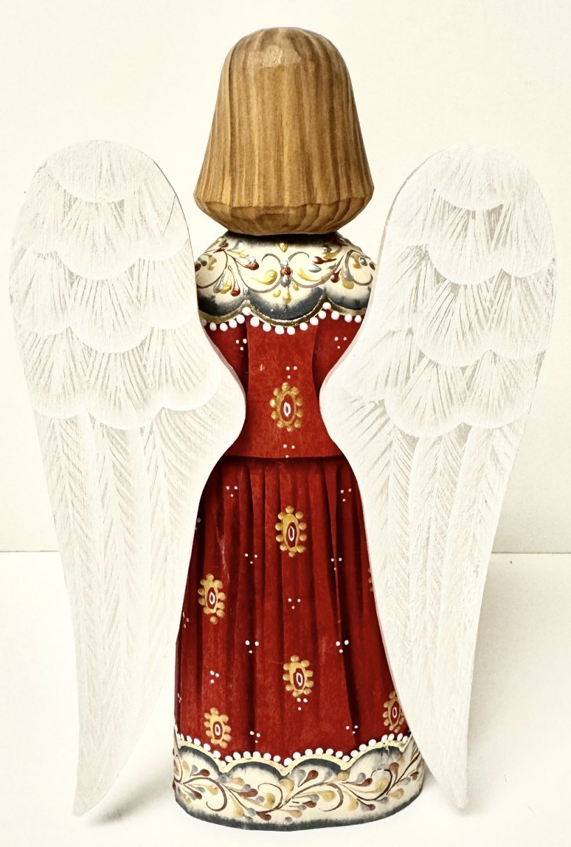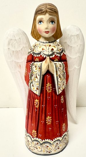 This wooden angel figurine is handcrafted in Moscow, Russia: carved out of linden wood and painted with acrylic. 8.3"H, unique.