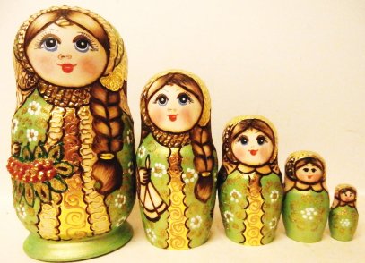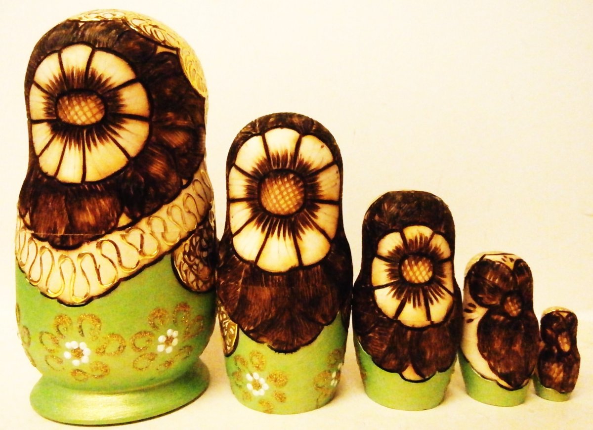 This nesting doll is crafted by hand: made out of linden wood, burned on wood and painted with acrylic. 8"H.
