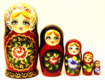 This nesting doll was handcrafted by hand in the workshop "Kvitok", Sergiyev Posad, Russia: made from linden wood and nicely painted with acrylic.