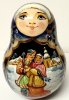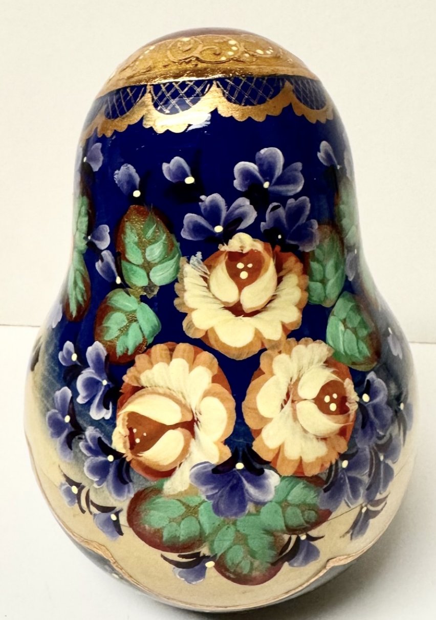 This wooden roly poly is handcrafted in Moscow, Russia: made out of linden wood and painted with acrylic. It shows a couple during Christmas time.