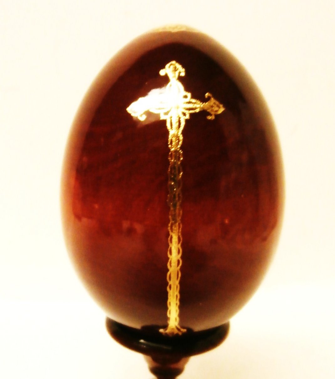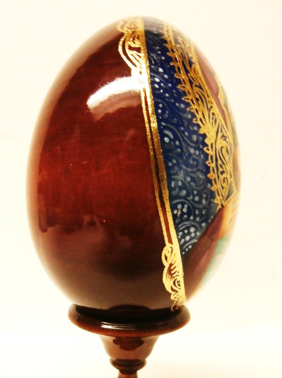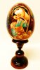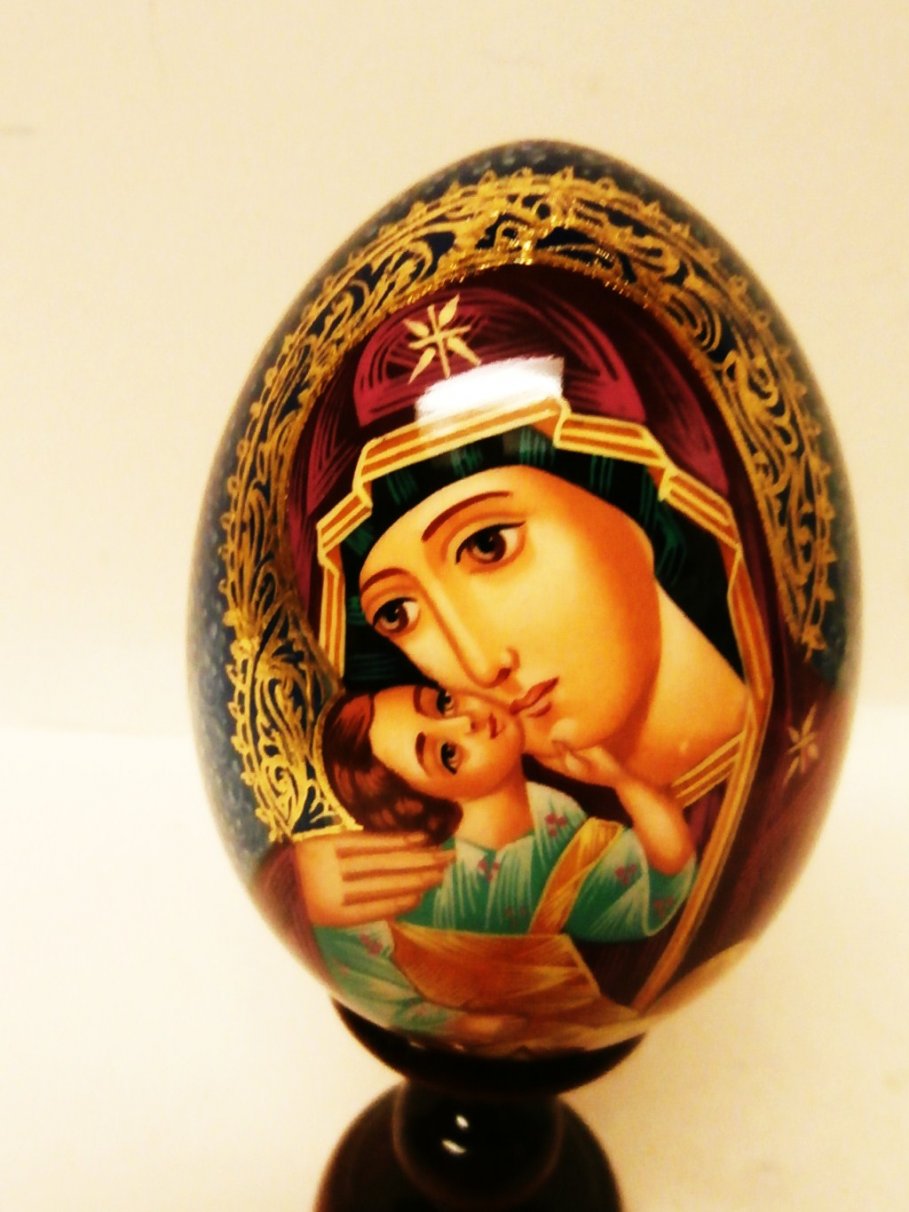 This egg is handcrafted: made out of linden wood and painted with acrylic. The subject matter is "Vladimirskaya Mother of God", one of the most venerated icons in Russia for centuries. Artist unknown.