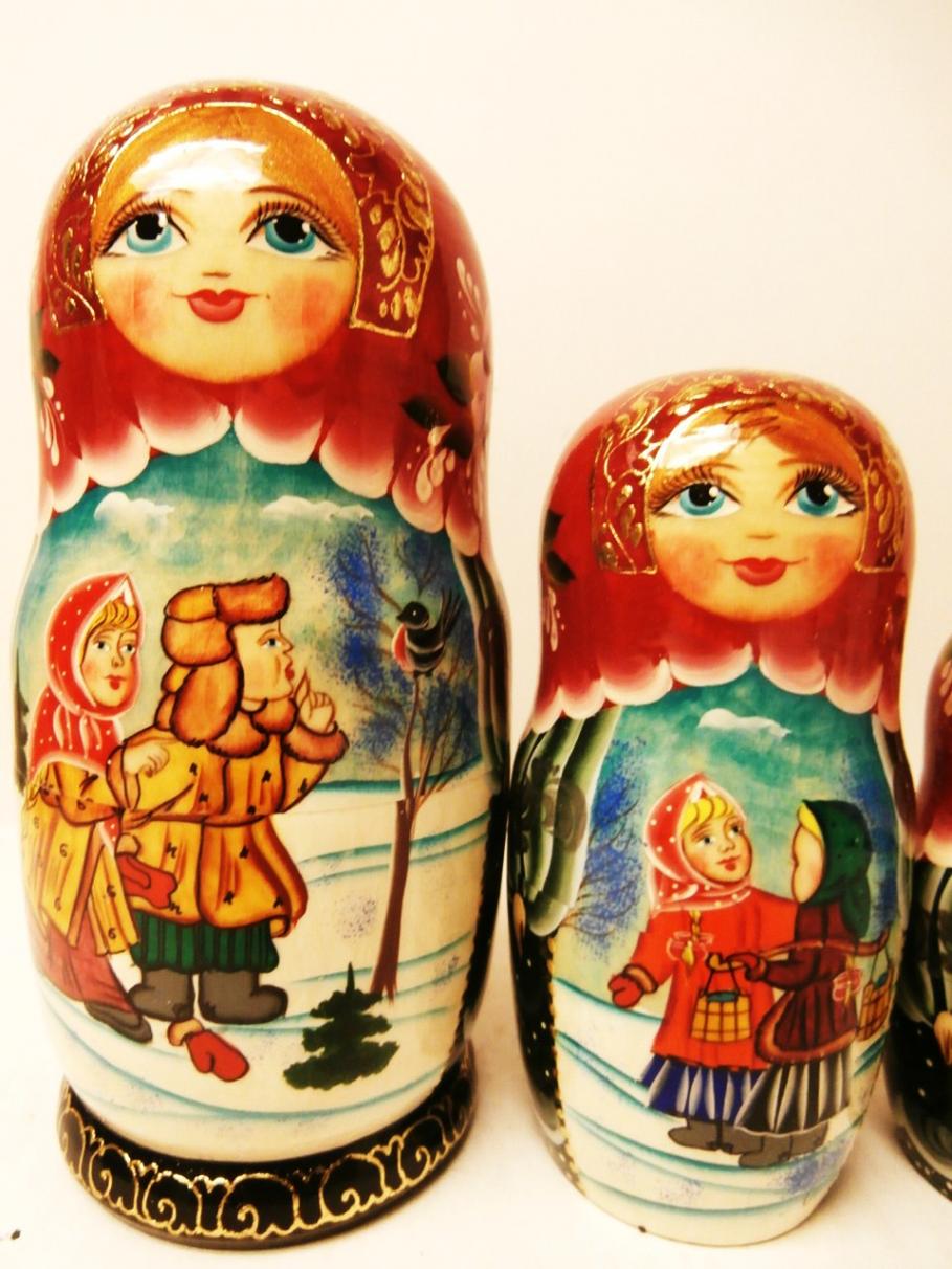 This nesting doll is crafted by hand: made out of linden wood and painted with acrylic. Workshop "Russkiy Dom", Moscow.