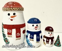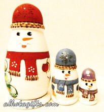 Nesting dolls with the image of snowman painted or carved on the doll are very popular. Russians love winter. Celebrating Christmas, New Year Eve and Russian pancake week Maslenitsa as well as other festivals during the cold part of the year are only few in between other festivities which are loved by Russians and celelbrated by them. One of the main characters of winter along with Russian Ded Moroz (Santa Claus) and Snow maiden is a snowman. This fictious character in Russia as well as in other countries is made of three balls of snow, when the snow is closed to its melting pot. Every ball is just rolled until it becomes rather big and could be installed one above the other. Russians love decorating snowman with hat, gloves and sometimes even with clothers. He is given a carrot as a nose. His eyes are installed with the pieces of coal. A neighbor can donate a scarf for fun. And the snowman is ready to go for the joy of adults and children alike.